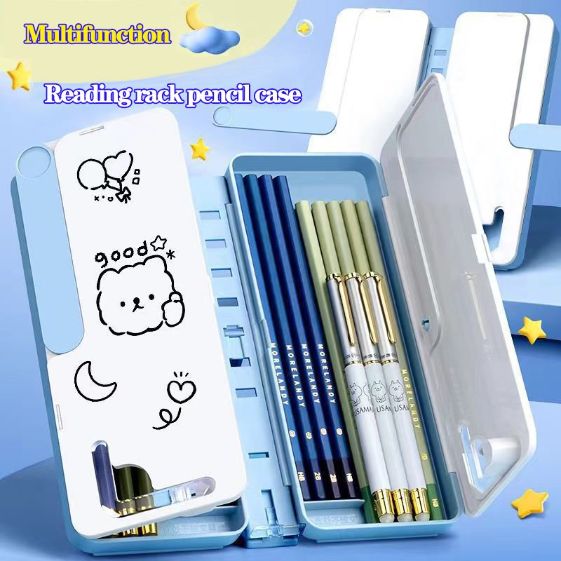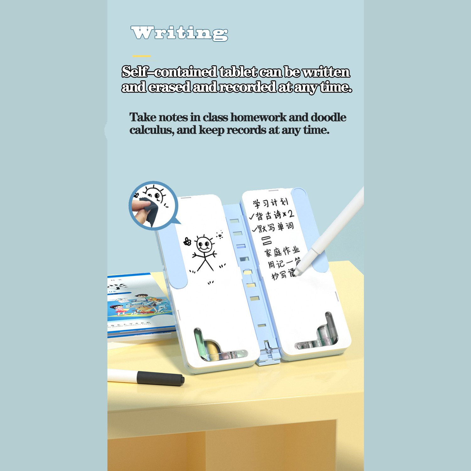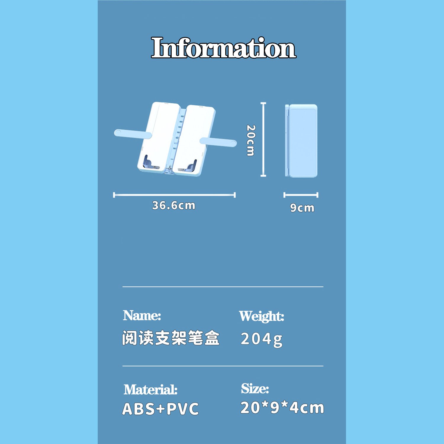 ✍【Multifunctional 3-in-1 Design】:This reading bookshelf pencil case integrates 3 core functions in one: it serves as a book stand (holding books, notebooks, tablets at an ergonomic angle), a double-layer pencil case (organizing pens/stationery), and an erasable whiteboard (for quick notes/doodles). Ideal for studying, homework, and daily organization.